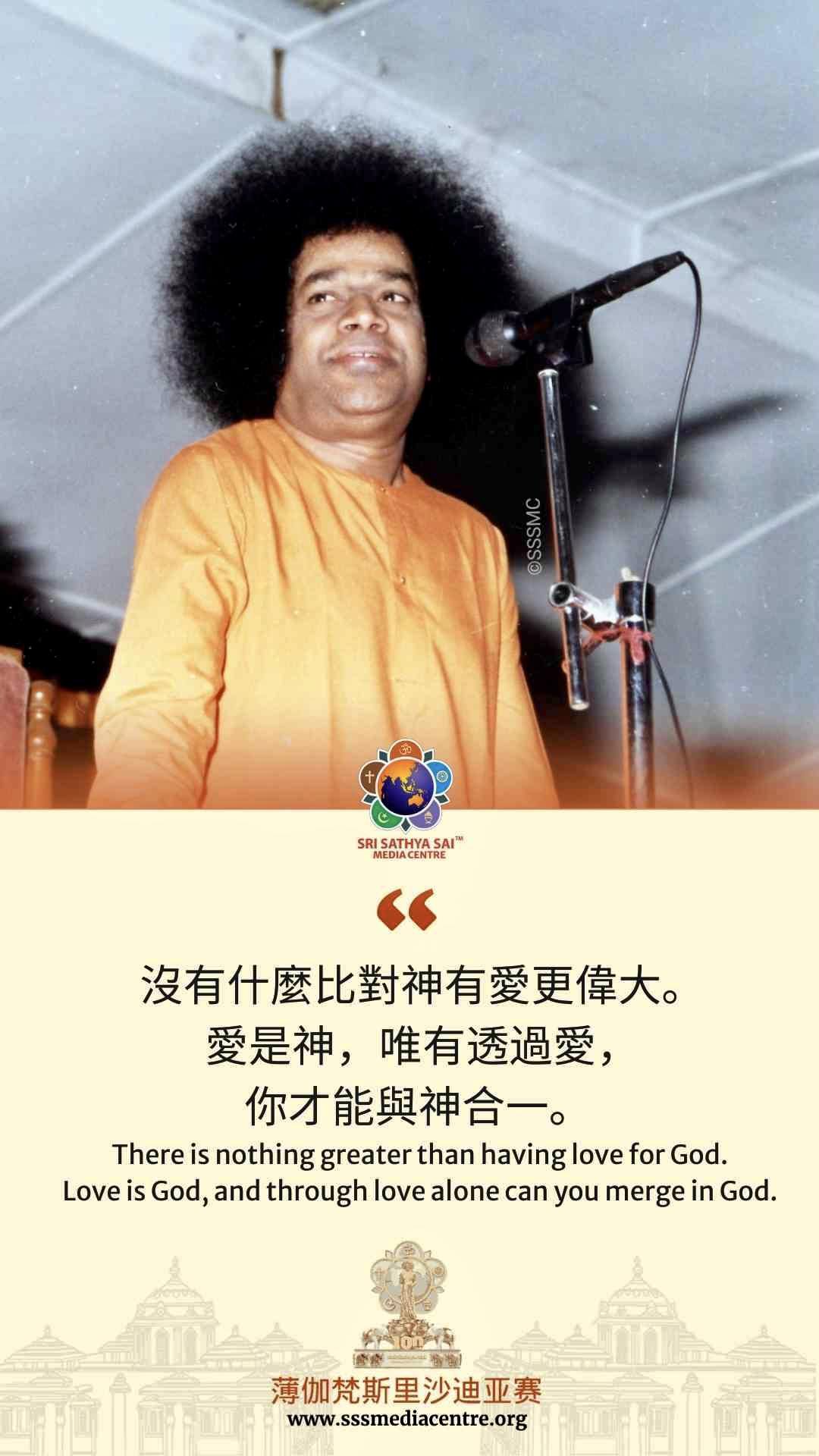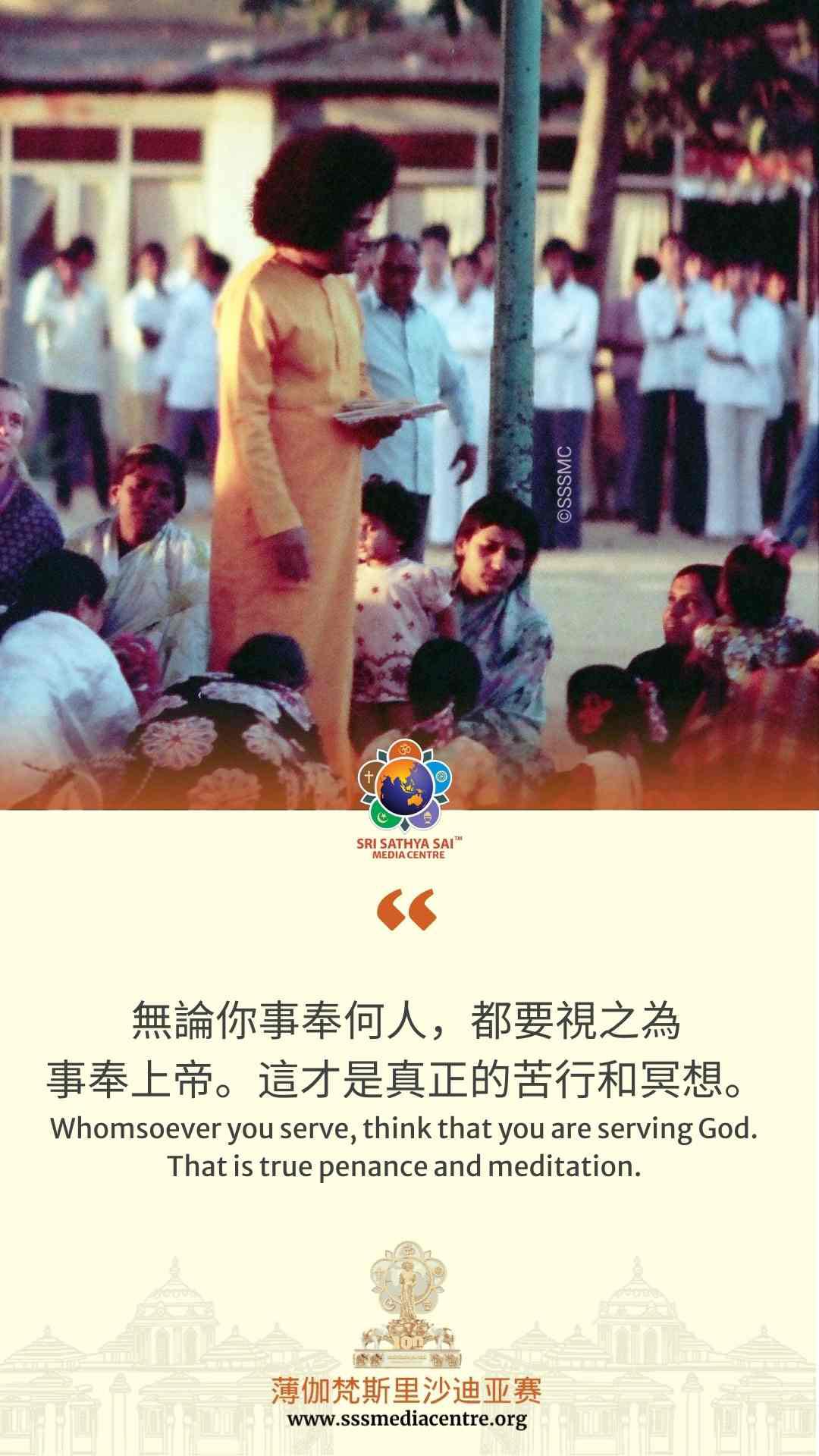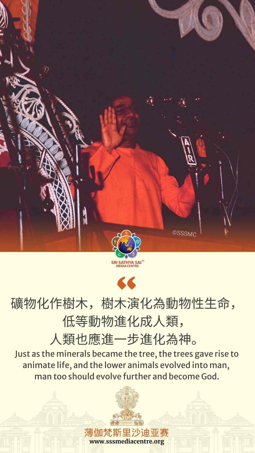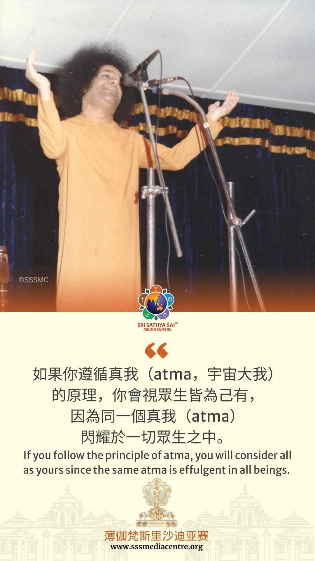 賽巴巴指引你將阿特曼(Atma, 真我)視為你最親近的親人,比你的家人、血親和最親愛的後代更親。如果你做到這一點,你就永遠不會偏離正道,唯有正道才能維持這種親情。對家庭的依戀甚至會阻礙你履行正當的職責,而對神的依戀卻會使人以奉獻之心履行職責,從而確保喜悅和成功。它能激發人,任何其他方式都比不上它。在履行職責的過程中,它賦予人至高的智慧。因此奉勸諸位:不要抱著明心見性的希望而入世;意識到自己有神性之後再入世,因為那時你會以新的眼光看這個世界,你的生命本身也會成為一場長久的愛的節慶。有很多人將他們的學問和聰明,甚至是吠陀學識,用於枯燥的辯論和競爭。他們沉迷於微不足道的勝利。他們宣稱社會是贏得此類勝利的競技場。但是,賽巴巴呼籲你們去追求並鞏固另一種社會,那兒不容有這種瑣屑慾望。