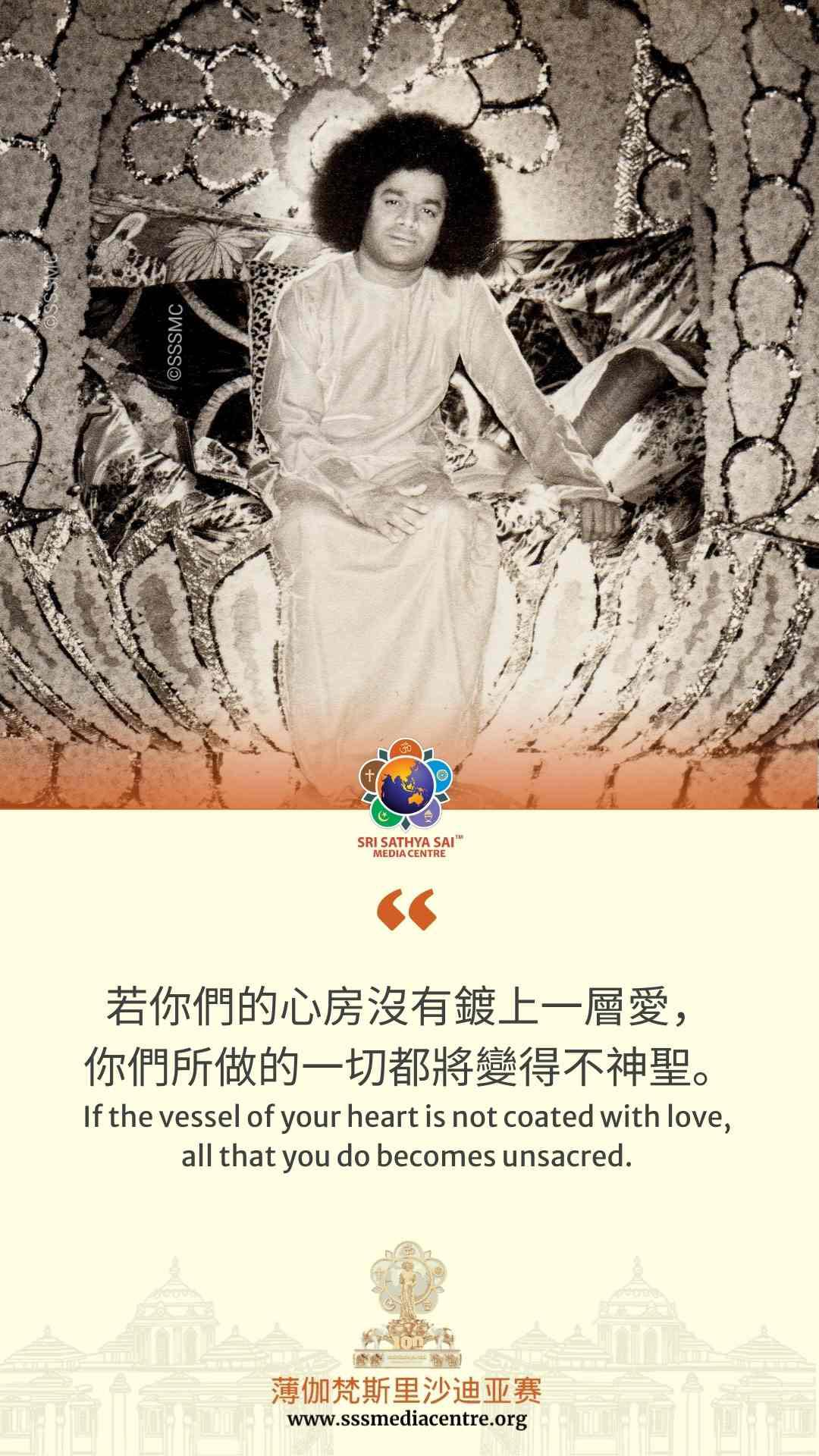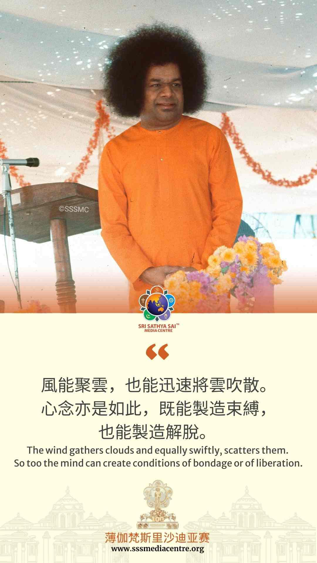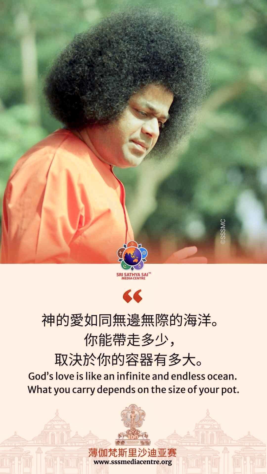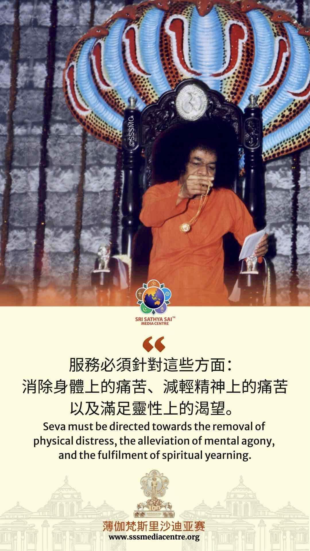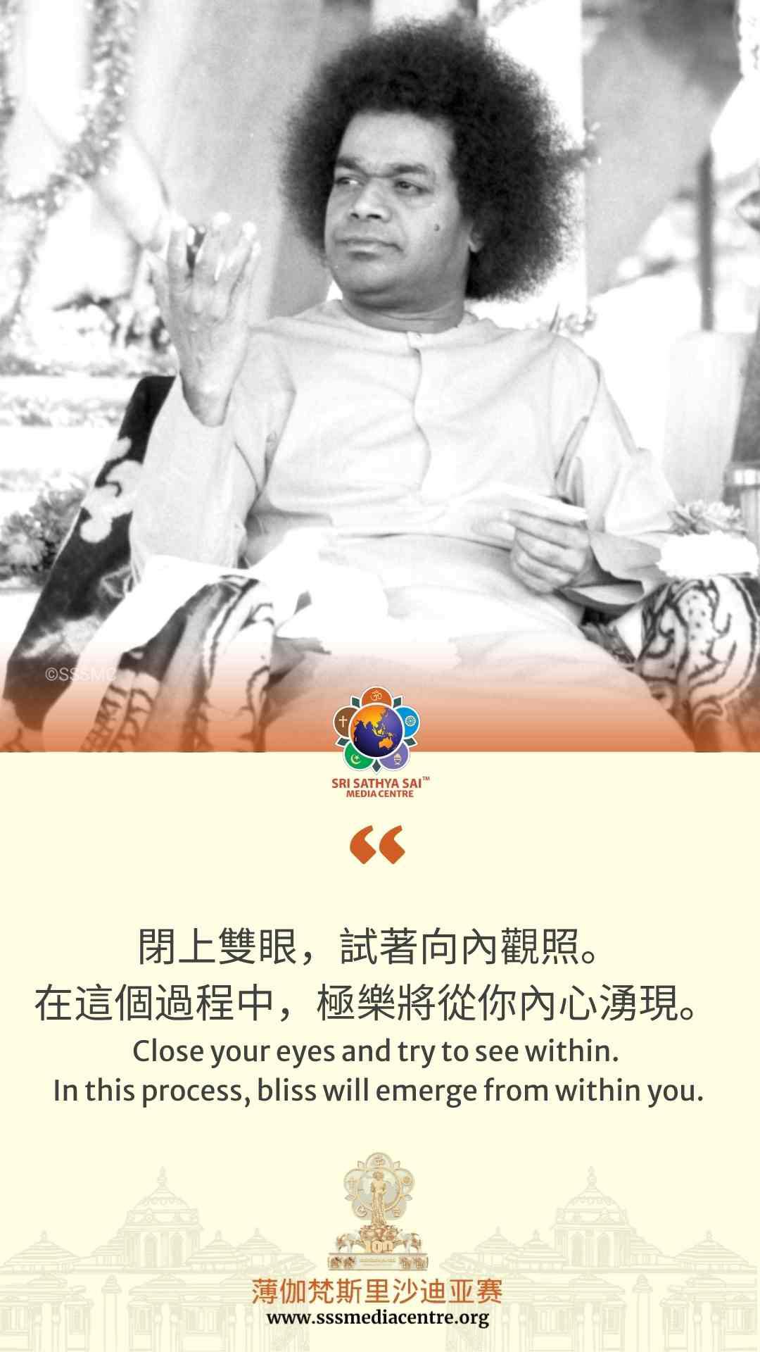 賽巴巴指引你將阿特曼(Atma, 真我)視為你最親近的親人,比你的家人、血親和最親愛的後代更親。如果你做到這一點,你就永遠不會偏離正道,唯有正道才能維持這種親情。對家庭的依戀甚至會阻礙你履行正當的職責,而對神的依戀卻會使人以奉獻之心履行職責,從而確保喜悅和成功。它能激發人,任何其他方式都比不上它。在履行職責的過程中,它賦予人至高的智慧。因此奉勸諸位:不要抱著明心見性的希望而入世;意識到自己有神性之後再入世,因為那時你會以新的眼光看這個世界,你的生命本身也會成為一場長久的愛的節慶。有很多人將他們的學問和聰明,甚至是吠陀學識,用於枯燥的辯論和競爭。他們沉迷於微不足道的勝利。他們宣稱社會是贏得此類勝利的競技場。但是,賽巴巴呼籲你們去追求並鞏固另一種社會,那兒不容有這種瑣屑慾望。