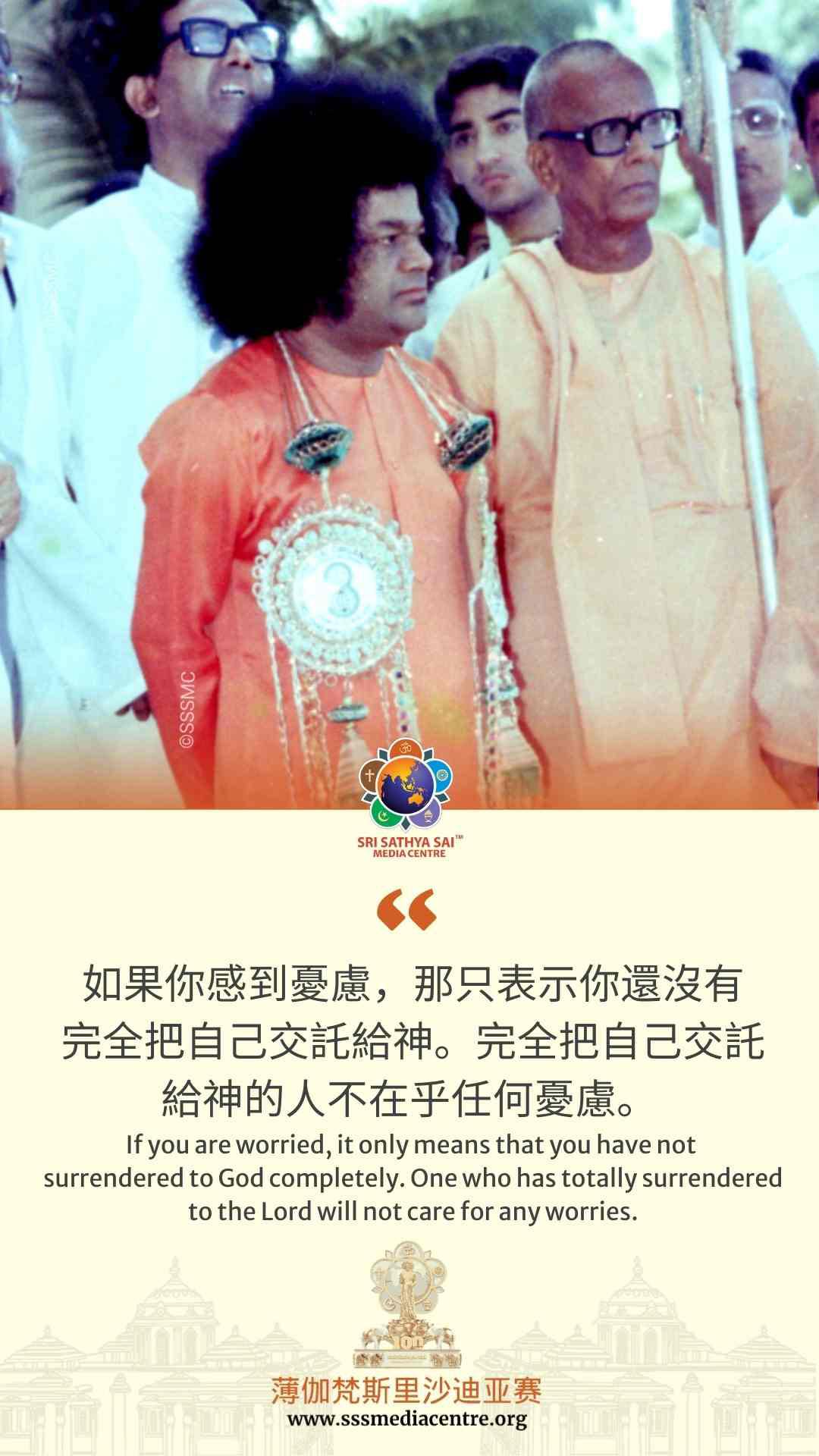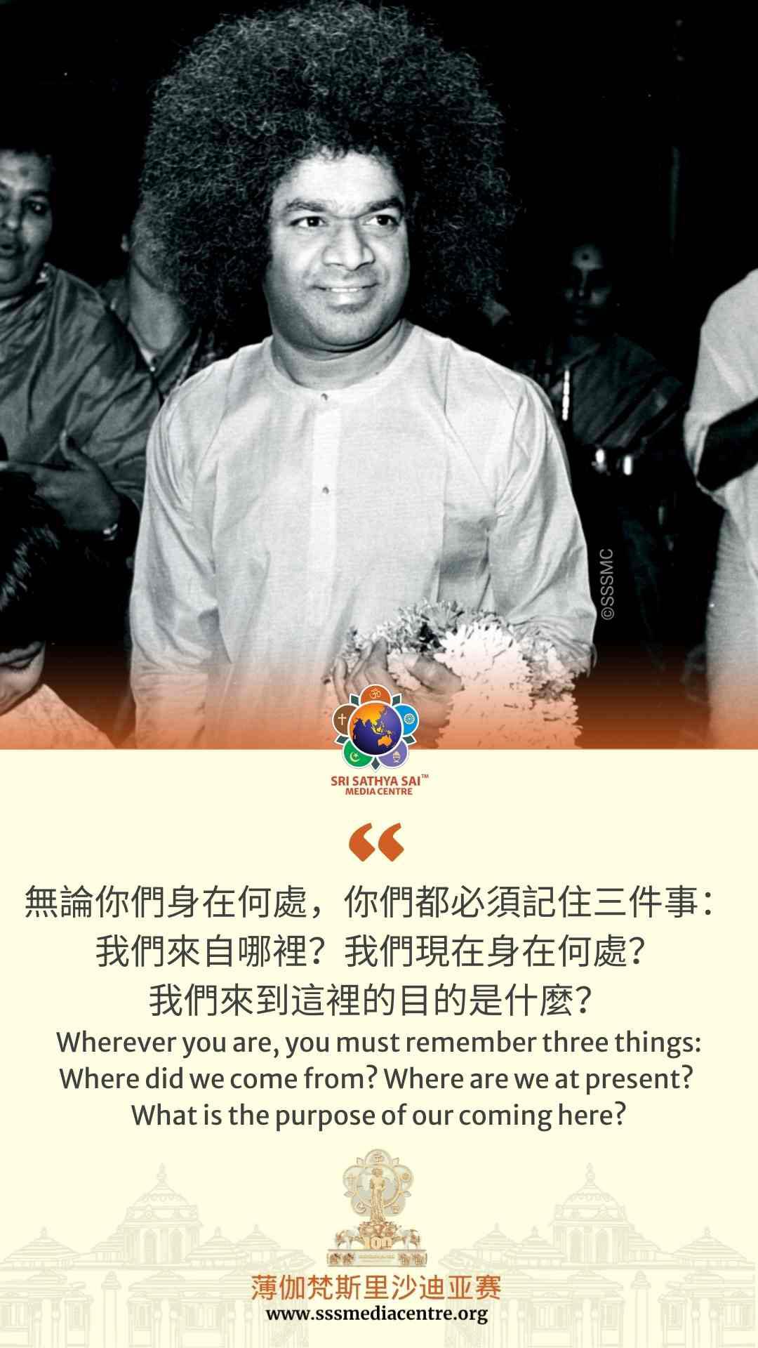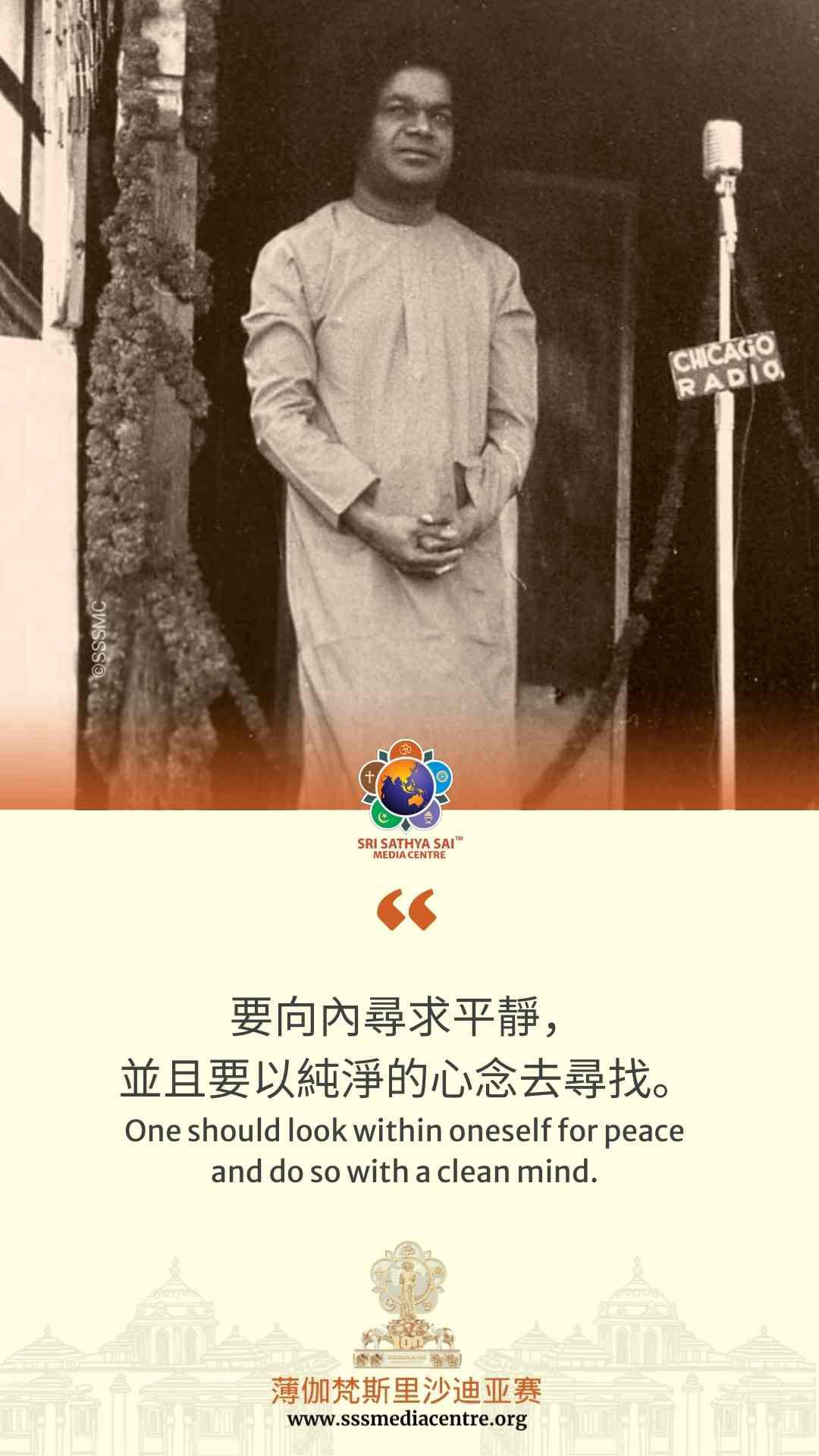 愉快時勿得意,痛苦時不沮喪,要培養淡定的平常心,在人生中邁進。Samatwam(同樣的心情,淡定的平常心)對於samajam(社會)的進步至關重要。 Sukhaduhkhe samekrutva labhalabhau jayajayau(以同樣的心情看待苦樂、得失、勝敗)。可是世人享受著一切舒適和愉悅,卻連一點點的困難都無法承受。連最輕微的困難也會讓他煩惱!如果你問一個富裕的人是否快樂,他會怎麼回答?他會說:「先生,我並不缺錢,我的兒子們生活美滿,我的家舒適便利,應有盡有。我擁有一切,唯獨缺少內心的平靜!」如何才能獲得內心的平靜?唯有當人意識到自己內在的神性時,才有可能。為什麼我們無法體驗到平靜?問題出在哪裡?我們不斷地問別人:「你是誰?」卻從未花功夫探究自己:「我是誰?」 這就是問題所在。一旦我們了悟到自己的本來面目,我們將永遠不會有悲傷和困境。