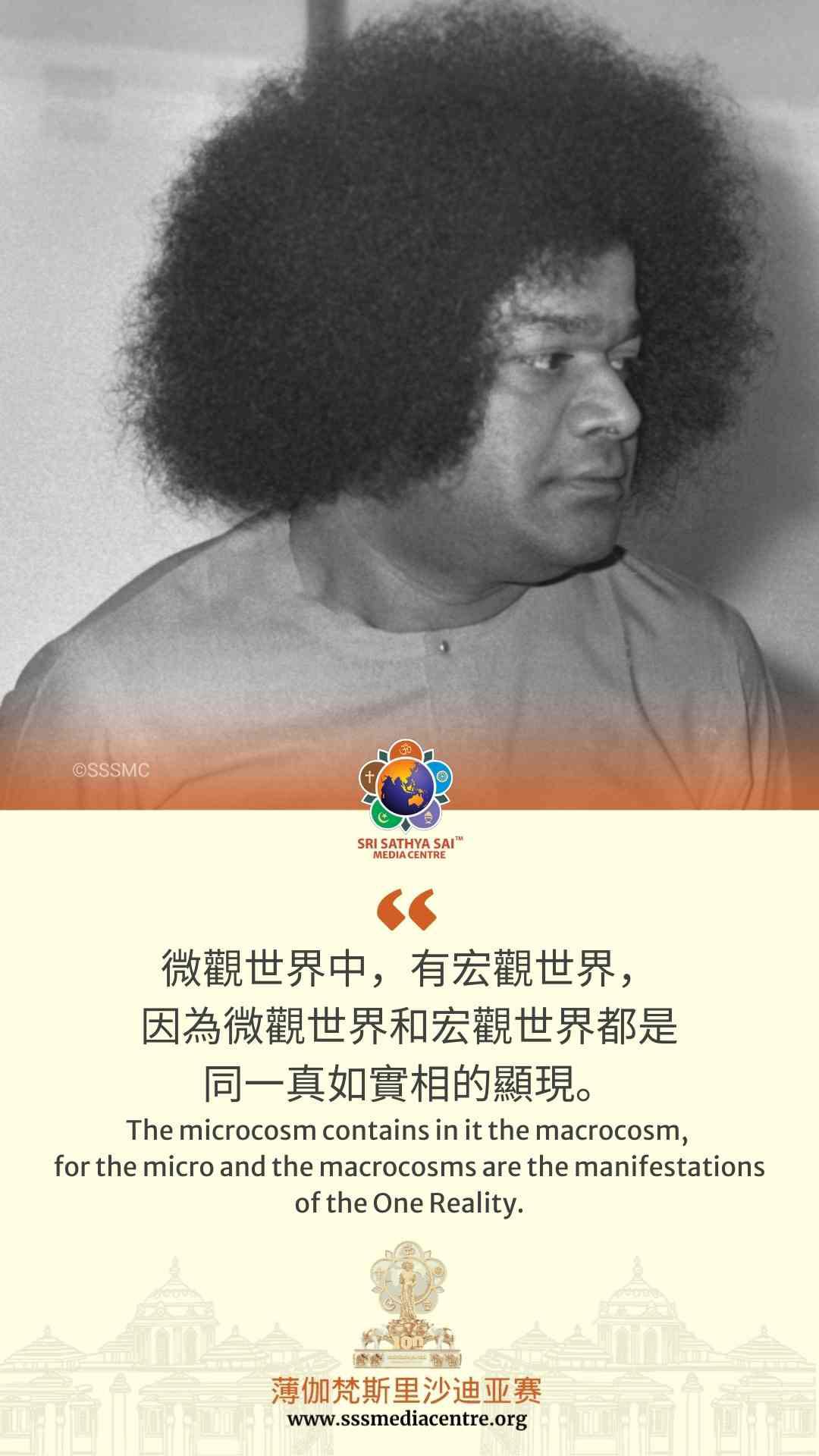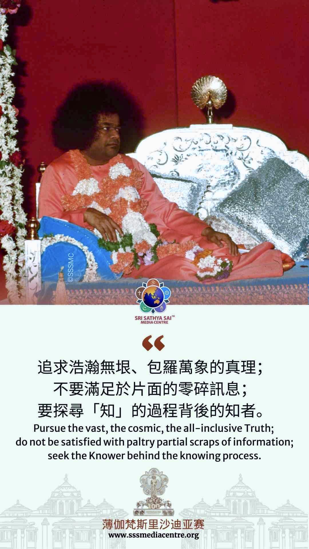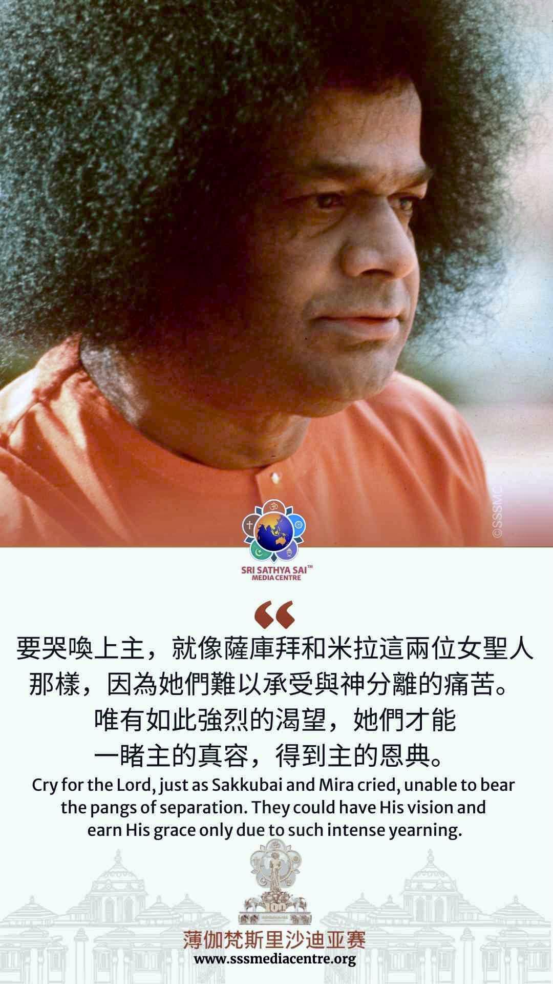 愉快時勿得意,痛苦時不沮喪,要培養淡定的平常心,在人生中邁進。Samatwam(同樣的心情,淡定的平常心)對於samajam(社會)的進步至關重要。 Sukhaduhkhe samekrutva labhalabhau jayajayau(以同樣的心情看待苦樂、得失、勝敗)。可是世人享受著一切舒適和愉悅,卻連一點點的困難都無法承受。連最輕微的困難也會讓他煩惱!如果你問一個富裕的人是否快樂,他會怎麼回答?他會說:「先生,我並不缺錢,我的兒子們生活美滿,我的家舒適便利,應有盡有。我擁有一切,唯獨缺少內心的平靜!」如何才能獲得內心的平靜?唯有當人意識到自己內在的神性時,才有可能。為什麼我們無法體驗到平靜?問題出在哪裡?我們不斷地問別人:「你是誰?」卻從未花功夫探究自己:「我是誰?」 這就是問題所在。一旦我們了悟到自己的本來面目,我們將永遠不會有悲傷和困境。